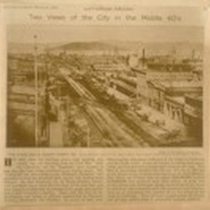 Two Views of the City in the middle '60's. The lower end of Market Street, 1865. From Sansome Street to the water front. Goat Island (Yerba Buena) in the middle distance. From T.E. Hecht's Collection. (#12, Down Market Street in 1865)