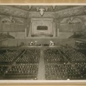Full titlePolice & Fire Depts. at the Civic Center Auditorium. With the Police on your right & the Fire Dept. on your left. The Police & Fire Commissioners are on the stand with his Honor Jas. Rolph Jr. The party with the light overcoat on seated in the center on the Grand Stand is Jesse B. Cook.