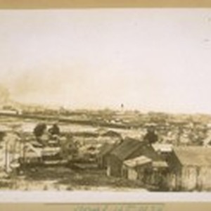 April 16th, 1929. From Silver Ave. and the cattle pens on the hill. Looking N.E. & showing the S.P.R.R. [Southern Pacific Railroad] trestle over the marsh lands. The P.G. & E. [Pacific Gas & Electric] gas tank, the sugar refinery, Butcher Town & a part of Bay View Dist