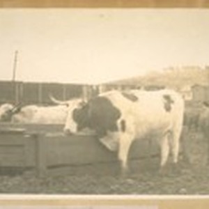 Full titleand still. The lead steer will lead them direct to the killing pens. He enters with the cattle and makes a complete circle around the pen, and comes out. By this time the last steer has entered and the gate is closed. For this work, the lead steer is allowed to go into a field of rich grass and have a good feed. This is a photograph of the lead steer for - Alpert Packing Company, Third and Evans streets, Bay View, San Francisco. From Jesse B. Cook, April 12, 1928
