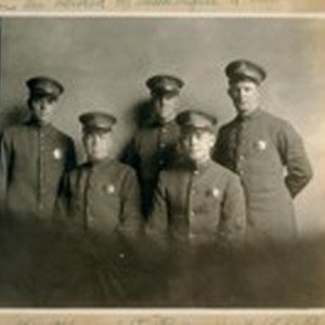 Traffic Officers, S.F. [San Francisco] Police Dept., L. to R.: H.F. Pfister, B.J. Getchell, E.P. Fischer, P.L. McEvoy, and J.F. Mackey, Jr., March 1924