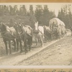 An Old time jerk line freight team, hauling freight from Truckee, Calif. to Sierra City, Sierra Co. Distance 63-miles and it takes 7 days to make a round trip. See the Bells on the lead horses