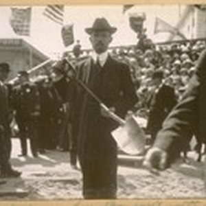 Photo same Sup. Bancroft with spade [at groundbreaking for the new City Hall.]