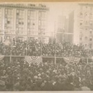 Photo the same. 1912 M.H. de Young talking. [People gathered to hear Madam Tetrazzini sing on Market Street, New Year's Eve.]