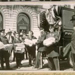 Two photos of Mr. J.S. Dunnigan, Clerk to the Board of Supervisors, receiving the S.F. [San Francisco] Police Petition for an increase of salary at the New City Hall to be voted on at the Nov. election, 1920