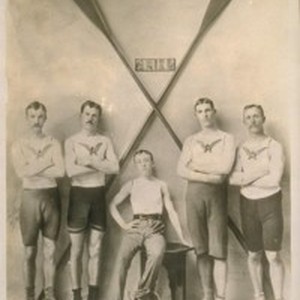 Left to Right: John Larkin - Bow, Jas. Wilson - Forward Waist, Ed. Wilson - Coxswain, Geo. Bates - after Waist, Harry Gink - Stroke. Ariel - Sr. Regatta - May 30, 1895