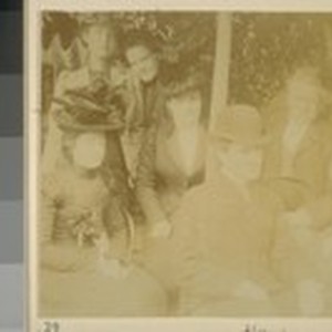 Probably Santa Cruz Mtns. or Los Gatos. [Herman George Scheffauer, third from right; Ambrose Bierce, second from right.]