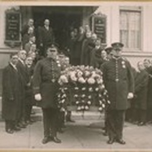 Funeral of Chief D.A. White. Left side from top down: Mark Noon, Sect. to State Prison Directors Justice Langdon, Supervisor's Hilmer, Powers, Judge Graham, Supervisor's Bath, Shannon and Power. Right side down: Supervisor Mulvahill, ?, Supervisor McLaran, Scott, Schmitz, Mc Sheehy, Wolf, Clerk to the Supervisor's J.S. Dunnigan