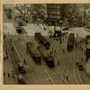 Looking west on Market from the Palace Hotel showing Geary Street & Lota's [Lotta's] Fountain. Mar. 1922