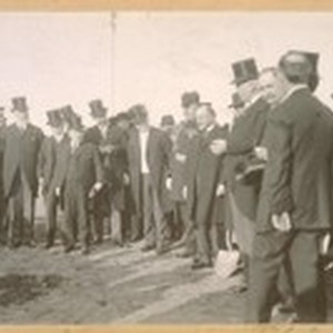 Same as above photo. [Ground Breaking of the Panama-Pacific International Exposition. L to R in high hats: [?], De Young-Foster, [?], M.J. [Brandenstine?] Scott-C.C. Moore, Gen. Mayor Rolph, Mr. Crothers of the San Francisco Bulletin.]