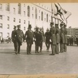 L. to R.: Capt. Lemon - Chief O'Brien - Mayor Jas. Rolph, Jr., Commissioner Theo. J. Roche - Jesse B. Cook - Andrew J. Mahoney. Oct. 27/23, in front of the State Bldg. McAllister & Polk Sts