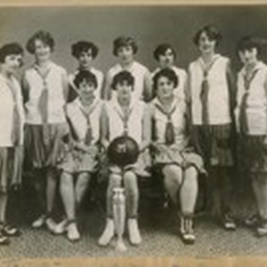 The Basket Ball Team of the Mercantile Trust Co. of Calif. April 21/26. L. to R.: Standing: Mrs. Lola Mansfield, Henrietta Renter, Lois Davis, Georgia Johnson, Mary Barrett, Claire Hofman, Alma F. Jenkins. Seated L. to R.: Anita Schwarzenbek, Grace Klanman, Margarett Chisholm