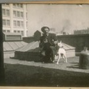 Engineer Frank Crockett, S.F.F. [San Francisco Fire] Dept. and his dog on the roof of the Bulletin, 1919