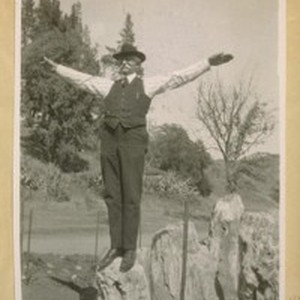 J.B. Cook at Calistoga, Napa Co. Standing on a petrified tree stump, 1920