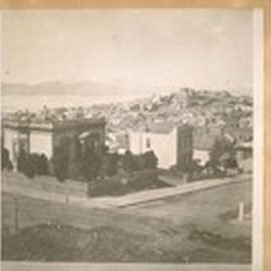 N.W. from Jones & Jackson Sts. About 1870. The large house in the center on the hill is the old Clay House. N.W. cor. Leavenworth & Vallejo Sts. and the house back of the Clay home was Mr. Clark's home of the California Bank