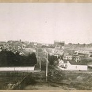 North on Fillmore St. from Green St. in 1886. The corner with the white fence is the old Frank Pixley's house. N.W. cor. Green & Fillmore St. The buildings on the right of the gas tank is [sic] Fort Mason