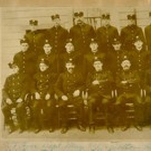 S.F. [San Francisco] Fire Dept., Bottom Row, L. to R.: H. Holmes, Tom Devine, Ike Gummendiez, W. Miskel, Fred Sayers, Jas. Bridge. Middle Row: Eugene Reilly, Pat Gordon, Chas. Haggerty, Pat Kenney, Jas. Hannan, John Brophy, Tim Collins. Top Row: Jas. Nannery, Chas. Centelwer, Tim Sheehan, F. Bell, Joe Lanthier, & Denney Mulcahey