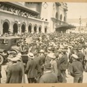 People waiting at the 3rd & Townsend Depot, June 1922 for moving [sic] actresses & actors from Los Angeles, Calif. who are to open the New Lowe Warfield Theatre, N.E. cor. Taylor & Market Sts