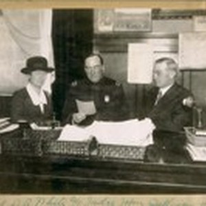 Chief D.A. White and Judge John Sullivan with a lady worker talking over a case, 1917