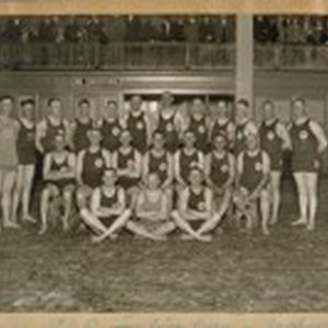 Standing, L to R: Cordray, Jackson, S. Heinrichs, G. Belger, O'Leary, B. Goetschel, A. Schmidt, G. Wathea, Coughlin, J. Brouders, Lieut. C. Fields, J. Burns. Seated: R. Hunter, M. Daley, P. Maloney, J. Collins, Driscoll, P. Fisher, M. Halen, Front Row: J. McInerney, Coach, C. Dredal [sic]. S.F.P.D. [San Francisco Police Department] July 4/24