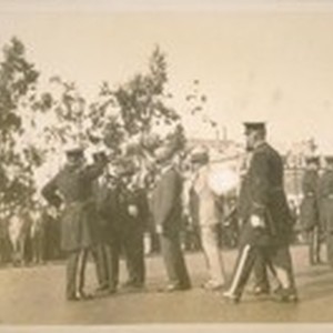Annual Inspection and Parade of the San Francisco Poice Dept. Nov. 5/27. L to R: Chief O'Brien, Mayor Jas. Rolph, Jr., Pres. of Com. Theo. J. Roche, Com. Dr. Schumate, Com. A. F. Mahony and Capt. Lennon