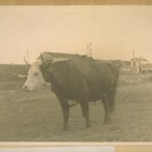 Full titleIn BUTCHER TOWN, San Francisco, the wholesale butchers keep their cattle in corrals quite a way from the killing pens, as they are not any too gentle and cannot be driven without a lead steer to keep them quiet and lead them to the killing pens. These lead steers are very gentle. The cowboys drive them up to the corrals where the beef cattle are, open the gate, and soon the first beef steer starts out of the corral and the lead steer starts on his way, with the cattle following him to the killing pens. The cattle will keep together so long as they have a leader, but without a lead steer they would scatter and the cowboys could not handle them in a city where there is so much noise, as they are from the ranges where all is quiet and still. The lead steer will lead them direct to the killing pens. He enters with the cattle and makes a complete circle around the pen, and comes out. By this time the last steer has entered and the gate is closed. For this work, the lead steer is allowed to go into a field of rich grass and have a good feed. This is a photograph of the lead steer for - H.M. Moffat and Company, wholesale butchers at Third and Arthur Street, Bay View, San Francisco. From Jesse B. Cook, April 12, 1928