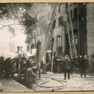 Natoma St. side of Waterhouse and Lester fire on Howard bet. 1st & 2nd Sts. about 1896. See Chief D. Sullivan at the Engine with the white helmet on