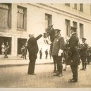 Nov. 3/28. [The annual inspection of the San Francisco] Police Dept. with Mayor Jas. Rolph Jr. petting the horse's head while Chief of Police W. J. O'Brien looks on