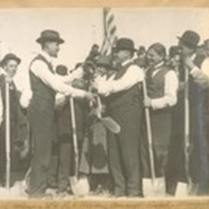 In shirt sleeves, L to R: R.E. Hayden, Bancroft-Rolph-Mauzy and T. Reardon of the Board of Works at the Ground Breaking of City Hall
