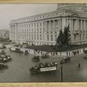 Fire Dept. Band in the Fire Prevention Parade, Oct. 8th, 1920. S.F. [San Francisco] City Hall Bldg