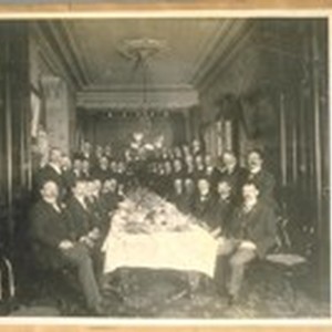 Full titleBanquet given to Geo. Birdsall on his promotion from Lieutenant of Police to Capt. of Police, San Francisco Police Dept., 1902, at the Maison Reich Restaurant, Grant Ave. & Geary St. Left to Right on the left side seated: Fred Green, Pat Kissam, Harry Braig, Jack Amend, Jas. Hayden, Jas. Pearl. Left side standing, Left to Right: Dan Sylvester, Peter Peshon, not known, Hiram Hutchings, Hans Christensen, John B. Martin, Pat Sullivan, Peter Chappelle. Back of the left rear, standing: Jas. Ward, Jack Evatt, Ed. Ring, & far back is Martin Tannian. Right side seated, Left to Right: Gardena, Con. Creegan, Bob Morton, Tom Handley, Jack Duane. Right side standing, Left to Right: Reporter not known, Dave Murphy, not known, Steven Bunner, Jr., Eugene Wall, Steven Bunner, Sr., Capt. Geo. Birdsall, H.H. Helmo, Wm. Coleman, Geo. Collins, Richard Skain, U.N. Bakulich. Rear row standing, Left to Right: Jas. Reavis, Jim McClean, Wm. Heins, Jack Herlihy, Rudolph Rudvaker