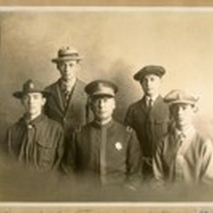Boys' Week at San Francisco, Calif. April 28th to May 4th, 1924 Inc. L. to R.: Robt. M. Hall of the Rochainbeau School, John Golebrick of the Frankin School, Louis Pelzner of the Everett School, Richard Elkins of the Grant School and Lieut. Fields of the S.F. [San Francisco] Police Dept