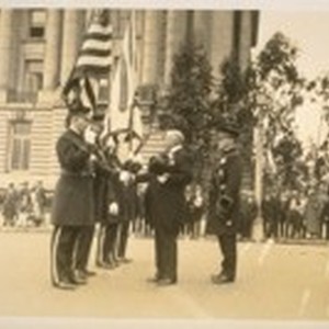 The annual inspection of the San Francisco Police Dept. with Chief W. J. O'Brien and Mayor Jas. Rolph Jr. and Commissioner Theo. J. Roche in the back of them on the Polk St. side of City Hall