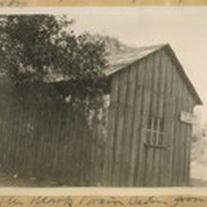 August 9/28. The Mark Twain Cabin from the gate. Halfway off the highway between Sonora, Tuolumne Co. and Angels Camp, Calaveras Co. Calif