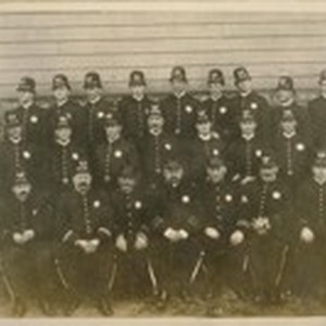 Full titleParty of Co. E-- Banner Company (Bush St./Station). May 5th, 1912. Top Row: Left to Right: Daniel O'Neill- Now Corporal Bureau of Identification. Emmett J. Hogan- Now Sergeant Bureau of Identification. John J. Lyons- Now Bailiff- Dets. 3 of Police Court. Gerald Ball- Now Patrolman- Central Station. Charles Grush- Now (Resigned)- Now with the State Reclaims Service. Emmett Moore- Now Lieut. -at West Add Station. James Collins- Now Patrolman- Bush Street Station from Traffic Bur. Patrick Hagerty- Now Patrolman- Central Station. James Miles- Now Patrolman- Central Station. Center Row- Left to Right: Gustave N. Wuth- Now Patrolman- Bush Street Station. Theo McCarthy Now Corporal- Bush Street Station. Gus Borghero. Thomas Feeney- Now Corporal- Edward Casey- Now Patrolman. Matthew Coffey- Now Patrolman- Mission Station. Edward Plume- Now Patrolman- North End. John McCausland- Now Corporal- Hack Detail. George McKenney Now Corporal- Complaint Office (Hdq'ts Co.). Lower Row- Left to Right: Cornelius O'Leary- Now Patrolman- West Add. Thomas Kerrigan- Now Patrolman- Bush St. Station. Serg't. L. Shaw- Now Retired. Lieut. Fred Green- Now Deceased. Serg't. F. Fontana- Now Deceased. John Lynch- Now Patrolman- Traffic Bureau. Marvin E. Dowell - Now Det. Sarg't.- Det. Bur. Capt. Henry Gleeson Commanding Company. This material was selectively digitized from a larger resource or collection.