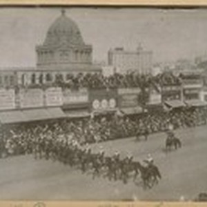 Portola Parade with Don Gasper de Portola on the horse with his hat in his hand. Oct. 22-25-1912 [1910?]