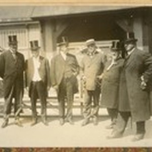 L to R: S.F. [San Francisco] Postmaster Chas. Fay, Rafael Weil--White House, S.F. Mayor Rolph Jr., Frank K. Lain of Pres. Wilson's Cabinet, Ex-Mayor Taylor, Ex-Supervisor Vogelsang, 1915