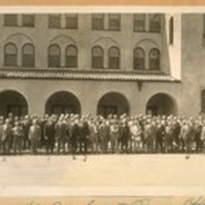 Meeting of the Bay County Peace Officers Association at the Sanoma [Sonoma] Inn - Sanoma [Sonoma] City - Calif. Aug. 26/31. Marked with cross is Jesse B. Cook - 1. Chief Wm. J. Quinn, S.F. [San Francisco] Dept., 2. Chief Harper of Burlingame Dept., 3. Geo. Hearst of the S.F. Examiner, 4. Joe Murphy of the American Trust Co