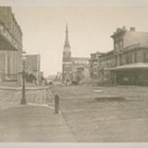 East on Post St. from Taylor St. about 1870. The Old Synagogue at the N. E. corner Post Taylor Sts. On the left and the 1st Congregational Church on the S. E. corner Post and Mason Sts