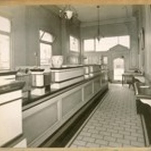 Mercantile Trust Co. of Calif.'s Branch Office at S.W. cor. Hyde & Pacific Sts., where on April 9/25 at 2 P.M., Police Officer Geo. W. Campbell was shot by Felix Sloper, an ex-convict, and on April 11/25 at 10 A.M. the officer died. Looking from rear of Bank to front door