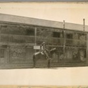 Front of the Blue Wing adobe house at Sanoma [Sonoma] City - Sanoma [Sonoma] Co., California, built about 1790 - Bernard Carr as Jauquin Murietta [Joaquin Murieta] on horse back - Aug. 26/31