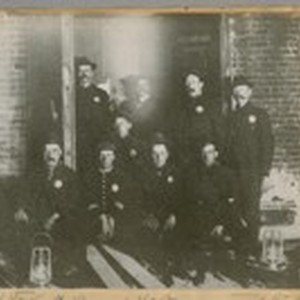 At the Vault Door of the Treasury of the City and County of San Francisco, Calif., after the fire of April 18/06. See the paper seal on the door. Those in the photo are L to R. Sergt. Ross - City and County Treasurer Bartell - Police Officers Maloney - P. Burns - S. Sandman - R. Ingham - H. Barnett - C. Jenkins and Chief Deputy Treasurer