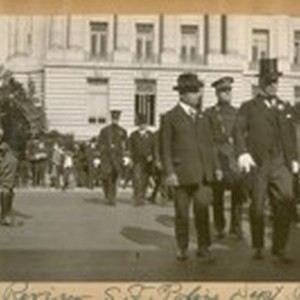 Annual Review S.F. [San Francisco] Police Dept. Oct. 1922. Left to Right: Theo. J. Roche, Pres. of Board - Mayor Jas. Rolph, Jr., and Chief of Police D.J. O'Brien in back Capt. H. Gleeson and Commissioner A. Mahoney