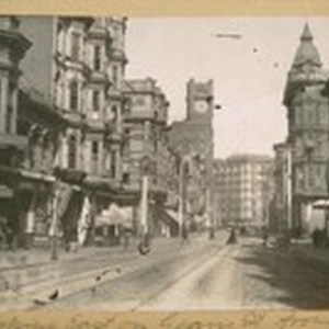 Looking East on Geary St. from Stockton. See the Chronicle and Palace at end of street, 1895