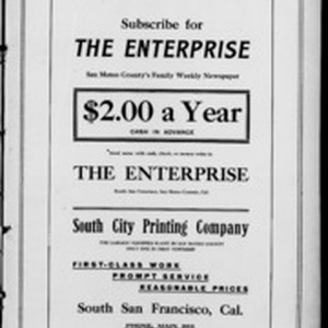 Local South San Francicsco newspaper documenting the town's growth as an industrial center between 1895 and 1925. Source material provided by the California Newspaper Microfilm Archive.