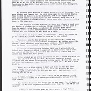 Japanese Immigrants, Farm laborers, Property purchased under citizen daughter's name, Japanese community (Sebastopol, Penngrove, Petaluma), Businessman cared of ranch during internment (Sam Nisson), Penngrove school, Petaluma school Topics covered include: Farm laborers; Japanese community (Sebastopol; Japanese Immigrants; Penngrove; Penngrove school; Petaluma school; Petaluma); Property purchased under citizen daughter's name.