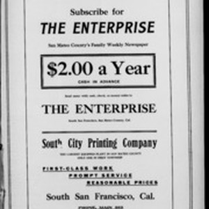 Local South San Francicsco newspaper documenting the town's growth as an industrial center between 1895 and 1925. Source material provided by the California Newspaper Microfilm Archive.