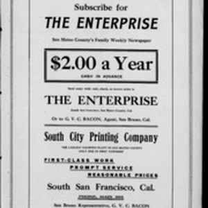 Local South San Francicsco newspaper documenting the town's growth as an industrial center between 1895 and 1925. Source material provided by the California Newspaper Microfilm Archive.