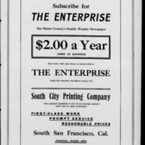 Local South San Francicsco newspaper documenting the town's growth as an industrial center between 1895 and 1925. Source material provided by the California Newspaper Microfilm Archive.
