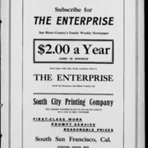 Local South San Francicsco newspaper documenting the town's growth as an industrial center between 1895 and 1925. Source material provided by the California Newspaper Microfilm Archive.